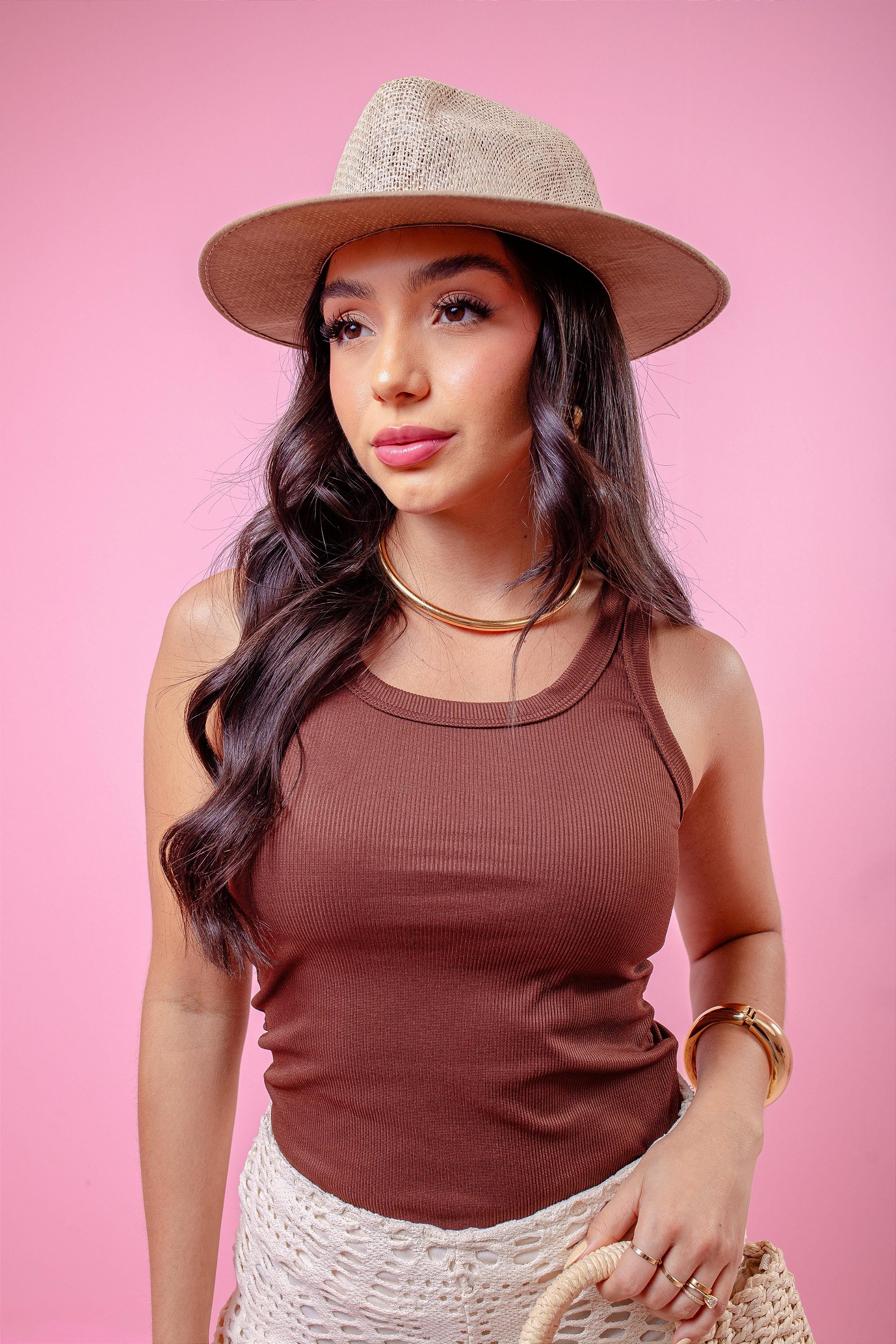 A Regata Gola U Marrom é aquela peça básica e versátil que nunca sai de moda. Confeccionada em tecido canelado de alta qualidade, ela garante conforto, caimento perfeito e estilo para o dia a dia. A gola U valoriza o colo e traz modernidade ao visual, permitindo combinações descomplicadas com shorts, saias ou calças. Uma peça essencial para compor looks casuais ou até mesmo mais sofisticados com os acessórios certos.